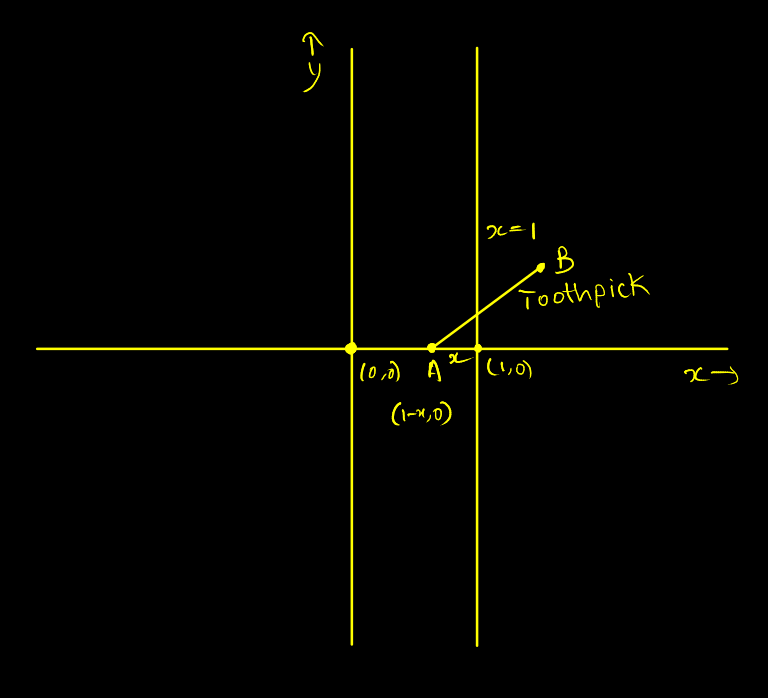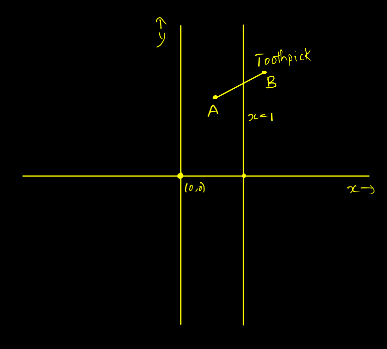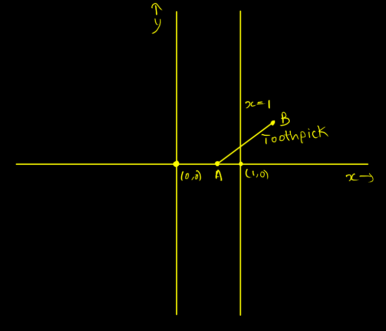 The most obvious relation a piece of paper has to a mathematical idea is a cartesian plane. Therefore, let the piece of paper be a cartesian plane. For simplicity, we may assume without loss of generality that the edge of the paper is the $y$-axis of the cartesian coordinate. Also, we may assume that the other edge of the paper, on which the line is drawn, is the line $x=1$ without loss of generality. Note that we have implicitly assumed that the length of the toothpick is $1$ (without loss of generality).