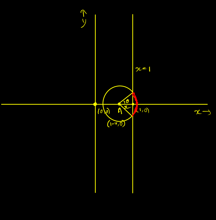 We have therefore found the probability that $AB$ intersects $x=1$ when $A$ lies at $(1-x, 0)$. What if $A$ is an arbitrary point on the $x$-axis as it is?